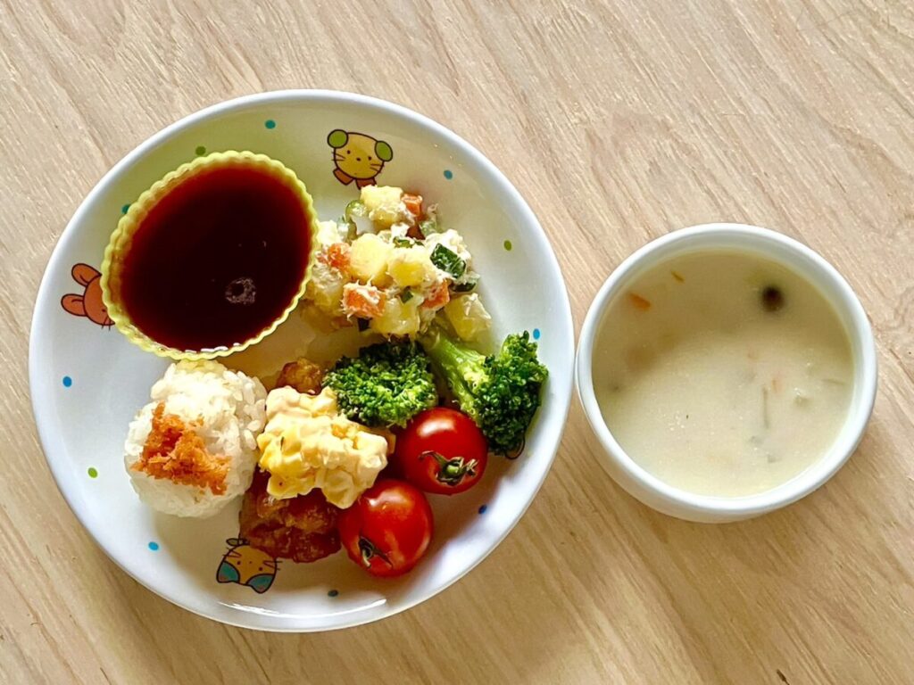 チキン南蛮と、さつまいもサラダに、鮭おにぎり。