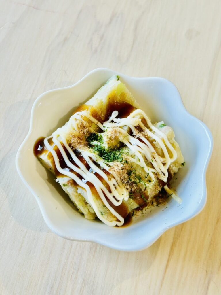 こども園のお好み焼きには、キャベツ、ネギ、ツナの他に絹豆腐も入っていてとってもヘルシーです🤗
