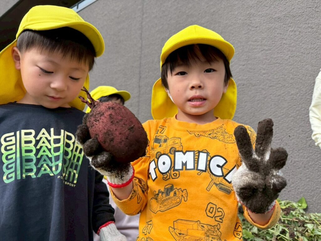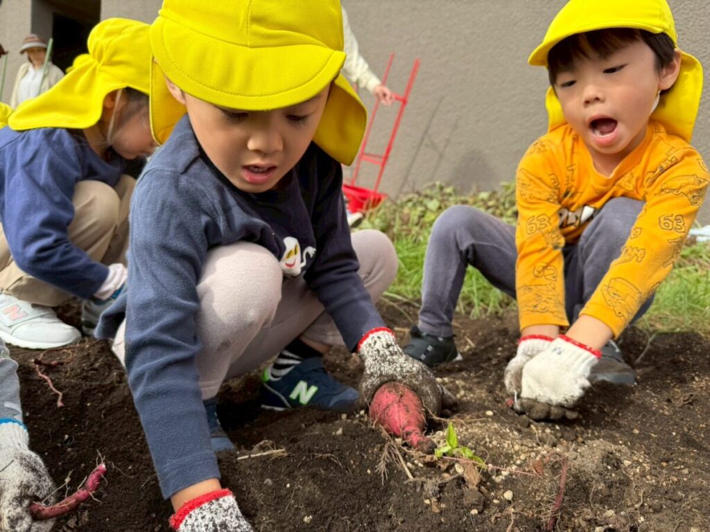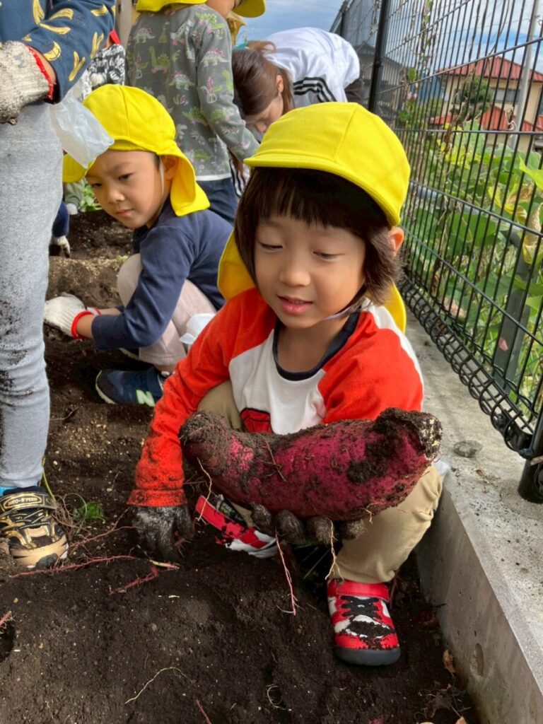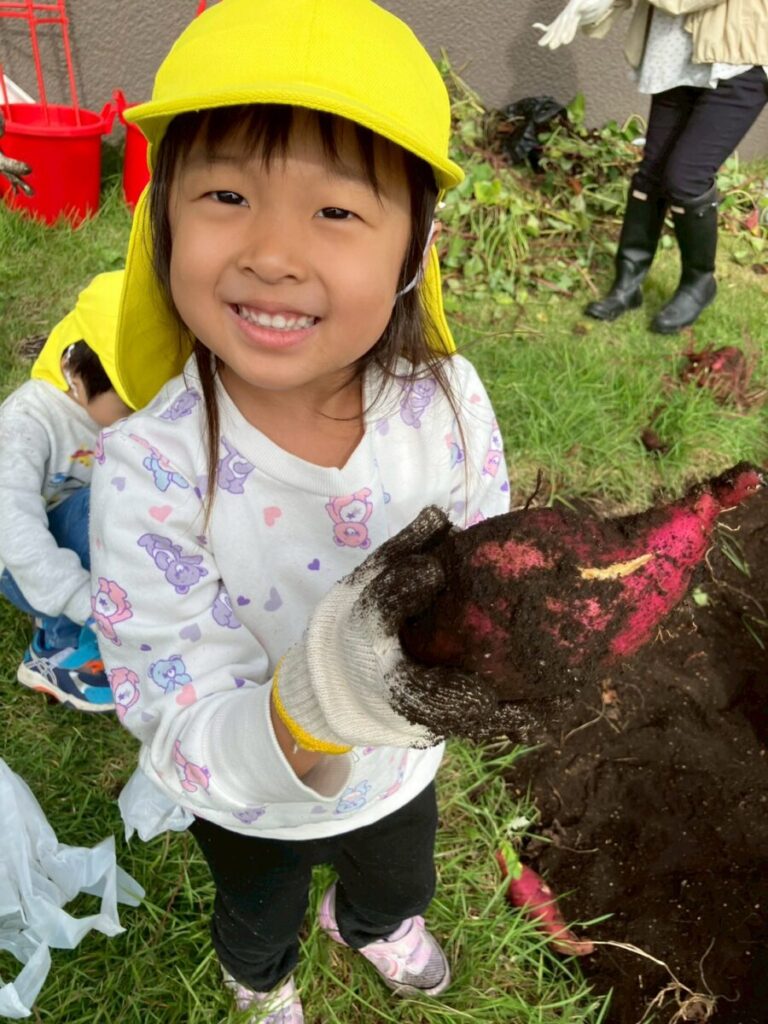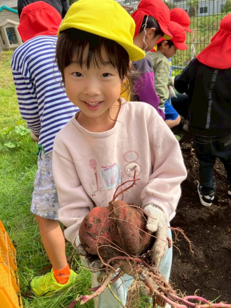 お芋が大きくてなかなか取れません💦周りの土を掘りながらお友達と力を合わせてお芋を収穫していました!