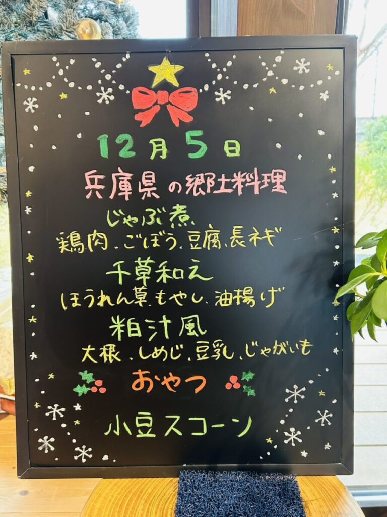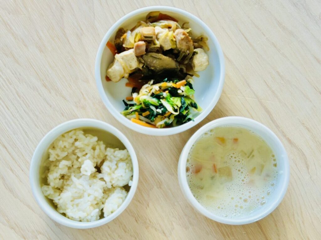 汁物…兵庫県は国内最大の日本酒の生産地です。粕汁は、製造工程でもろみを搾った後に残る酒粕を使った汁ですが、今回は酒粕の代わりに塩麹、酒、みりんを使用し豆乳と味噌を入れて作りました。まろやかな味でとても美味しかったです😋