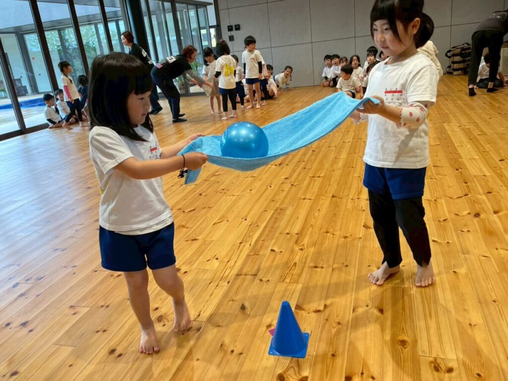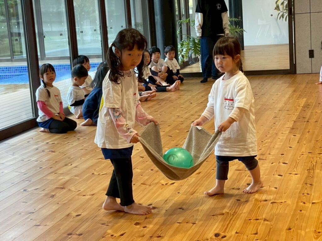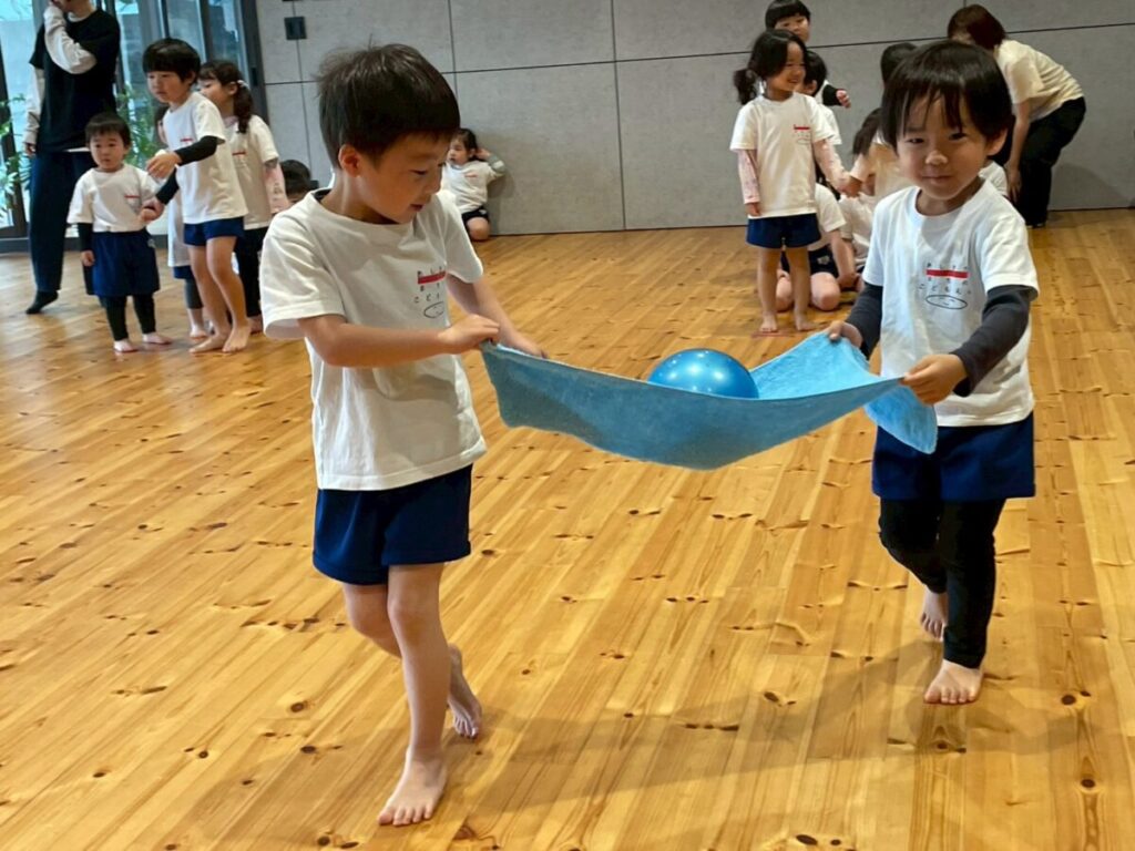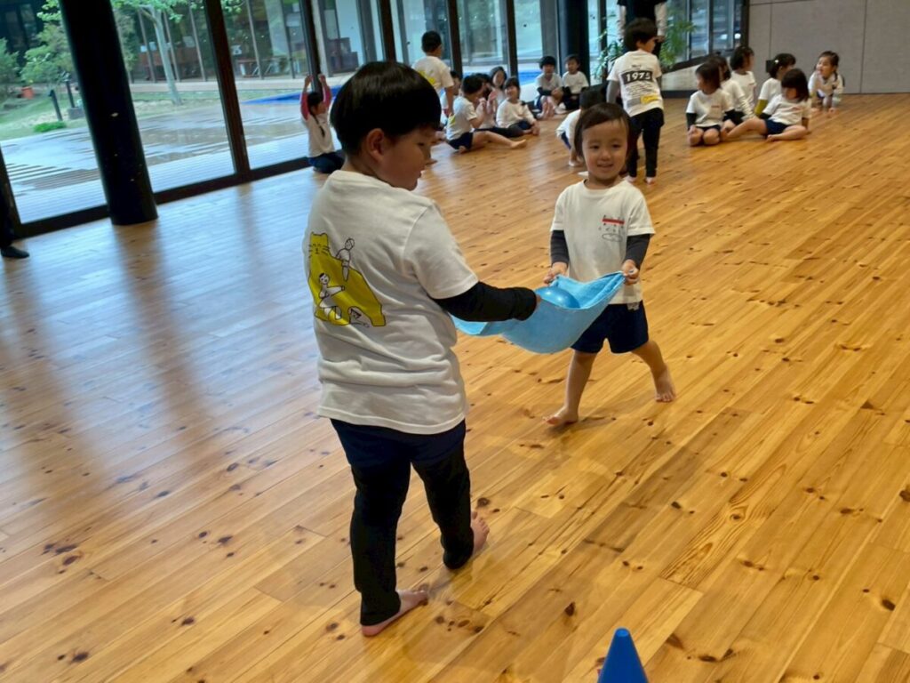 まず初めにタオルにボールを乗せて運ぶゲームを行いました。それぞれ異年齢でペアになり、協力しながらボールを運びましたよ~!
