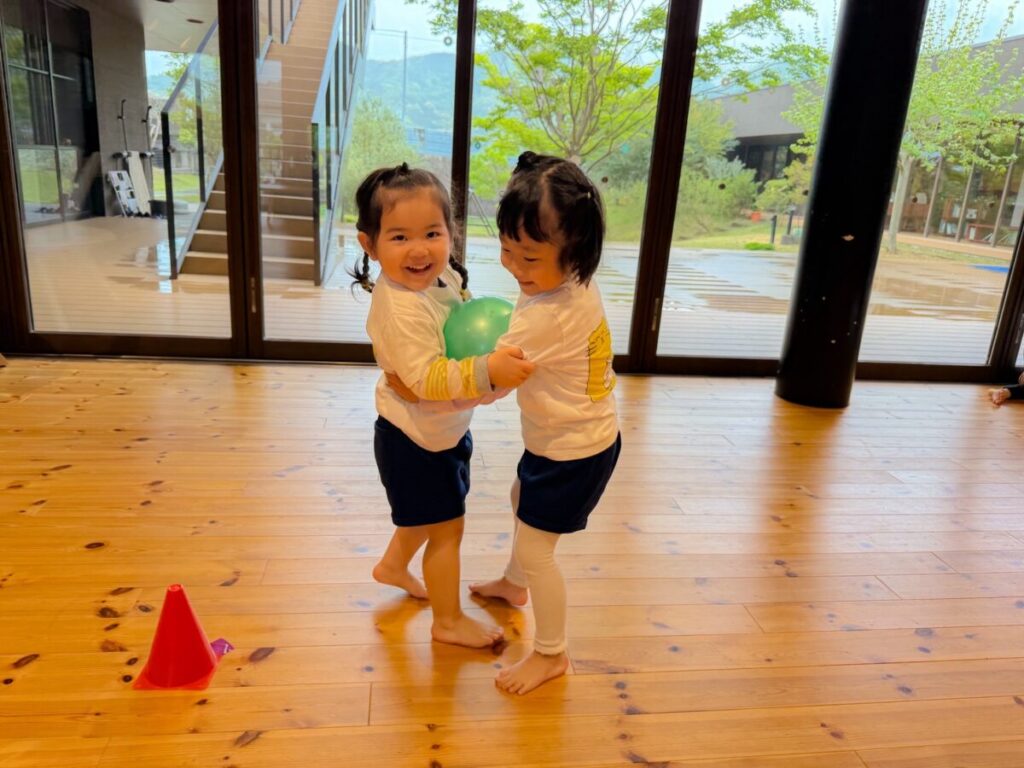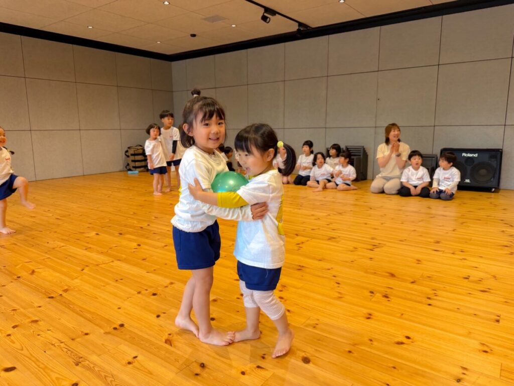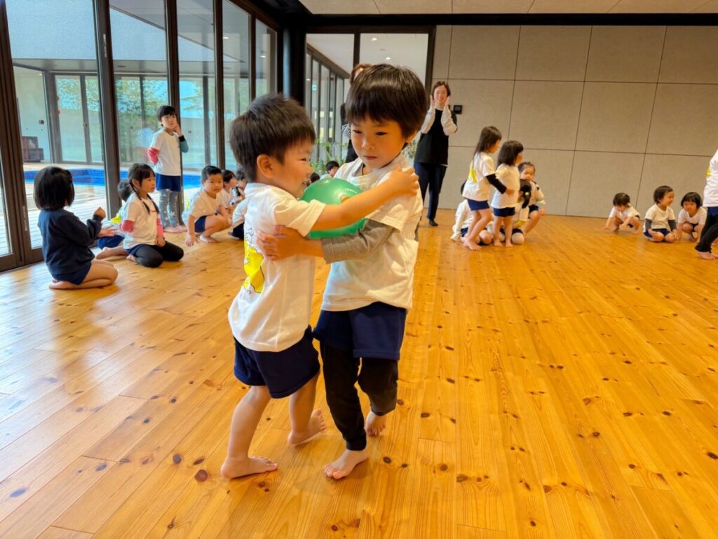 次に、お腹とお腹の間にボールをはさみながらボールを運びました!落ちないように慎重に、慎重に進んでいるペアや、走って進むペア、カニさん歩きのようにして進むペアなど、ペアによってそれぞれ個性が出ておりとても面白かったです笑