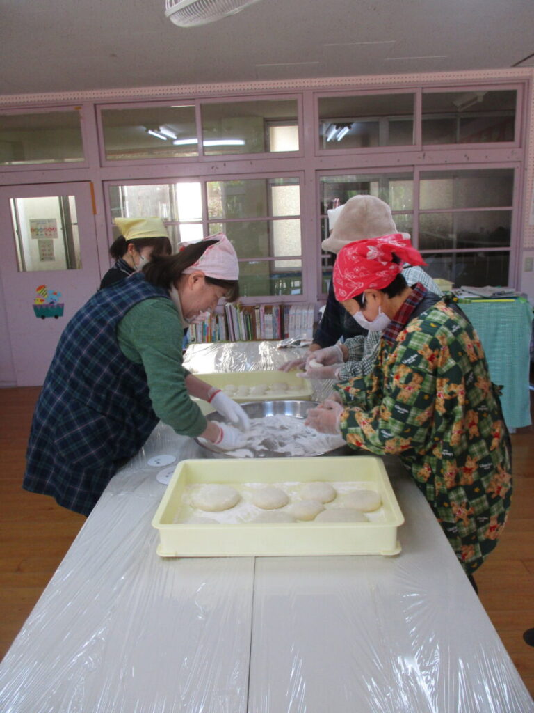 きな粉ご飯を食べた後はエプロンと三角巾、マスクをつけて…もちつき、頑張るぞ~‼