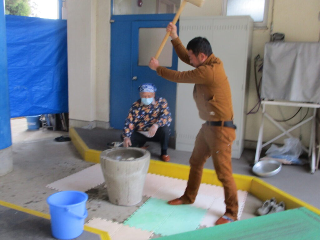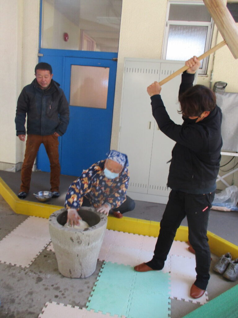 地域の方が蒸したもち米を杵でこねこねしてついていき、お餅になっていく様子を見た後、1人ずつ杵を持ってもちつきの体験をしました!