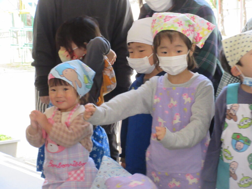 エプロンや三角巾をつけながらひまわり・ももぐみさんが「見て~かわいいでしょ?」「うん、かわいいね💖」「これかわいいね💕」と話していて…とても可愛かったですよ😍