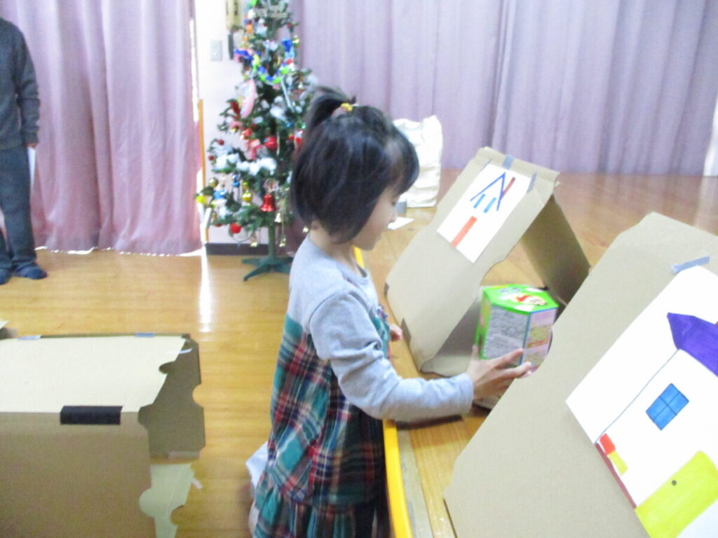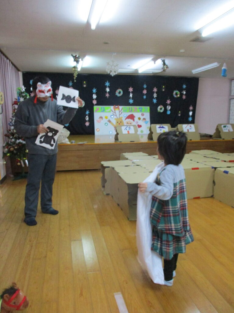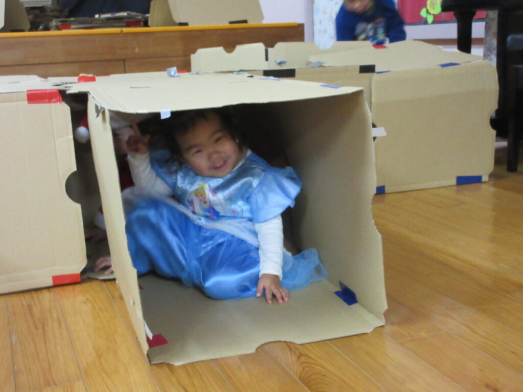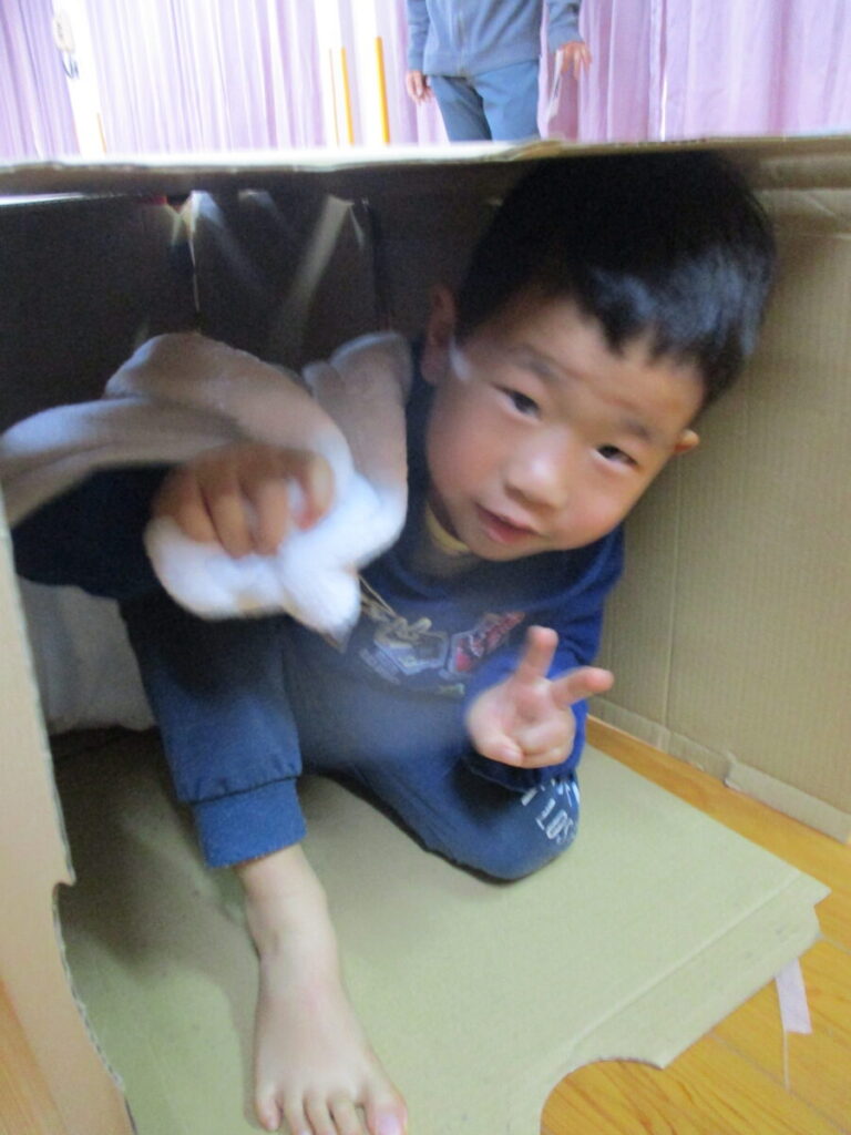 服や靴、お菓子、ぬいぐるみなどの中からどこに何を届けなければいけないかをキツネさんからよく聞き、ダンボールで作った迷路をくぐって各家まで届ける事ができました。