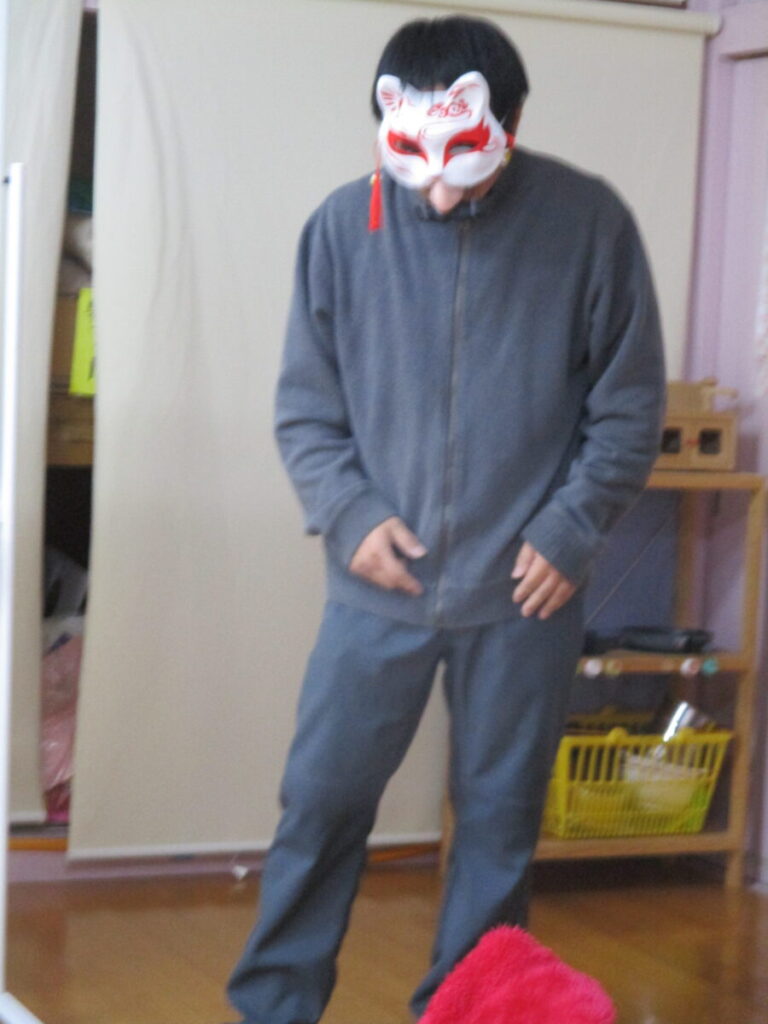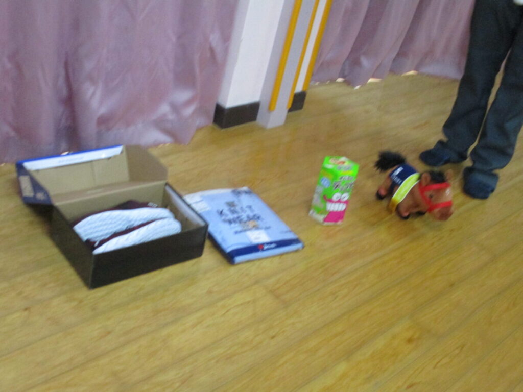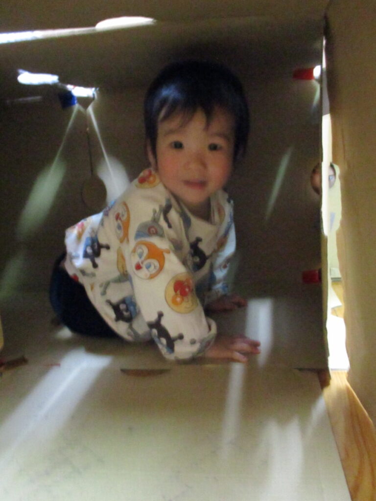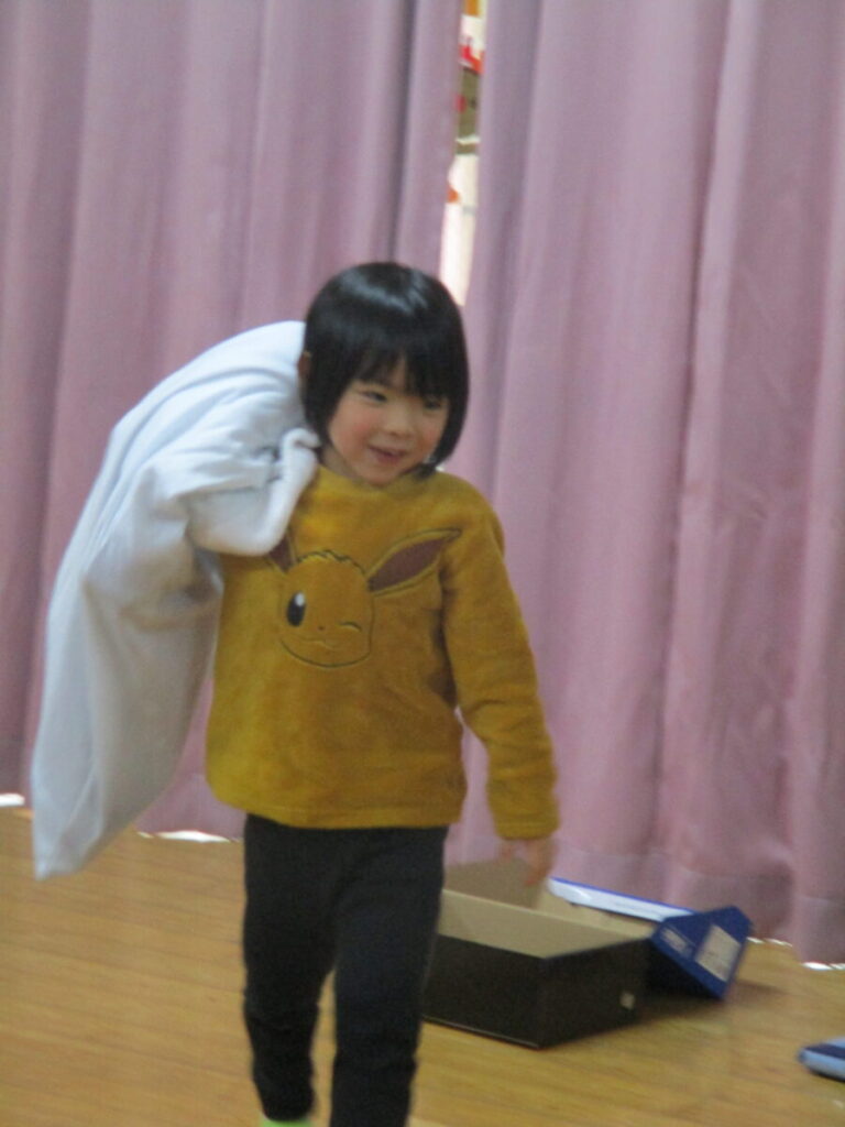服や靴、お菓子、ぬいぐるみなどの中からどこに何を届けなければいけないかをキツネさんからよく聞き、ダンボールで作った迷路をくぐって各家まで届ける事ができました。