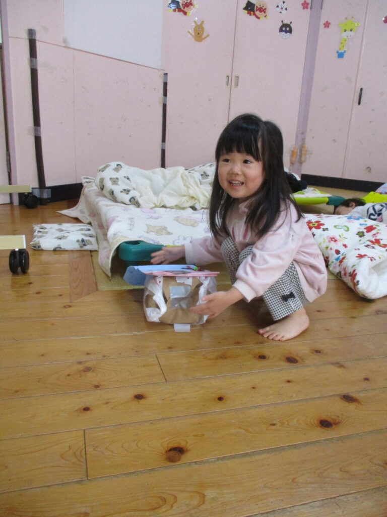みんなでハッピーバースデーの歌を歌い、いつも仲良く遊んでいるお友達からプレゼントをもらいました。