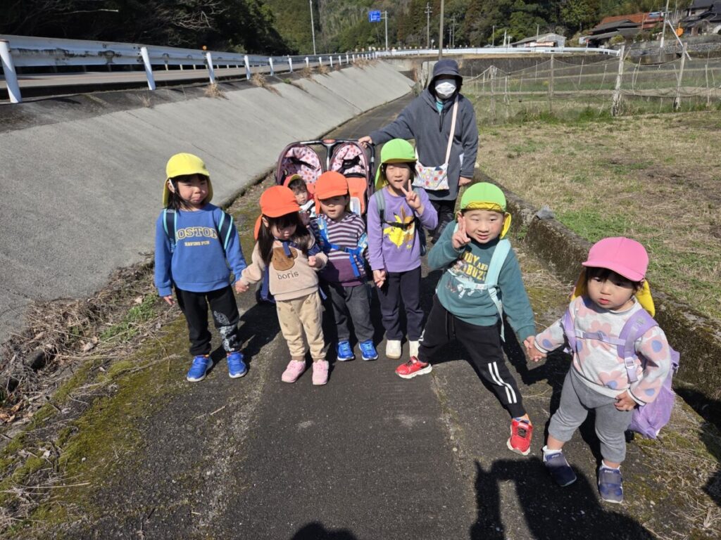 遠足に行く前に交通指導を行い、手を繋いで大野温泉センターまで歩いて行きました。