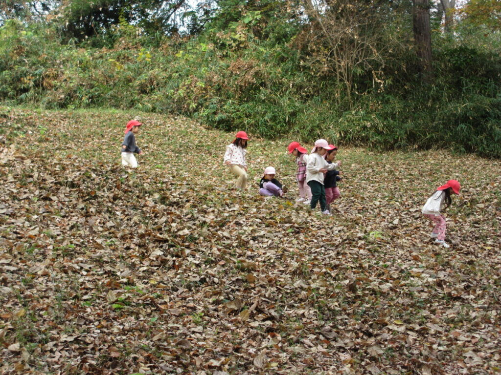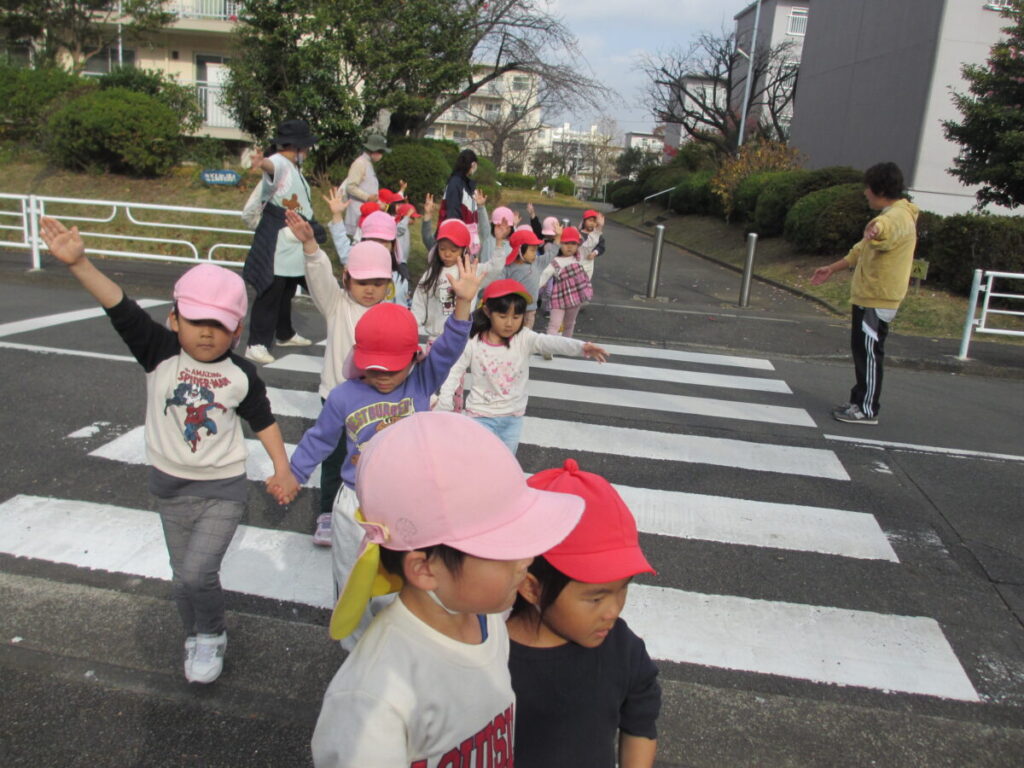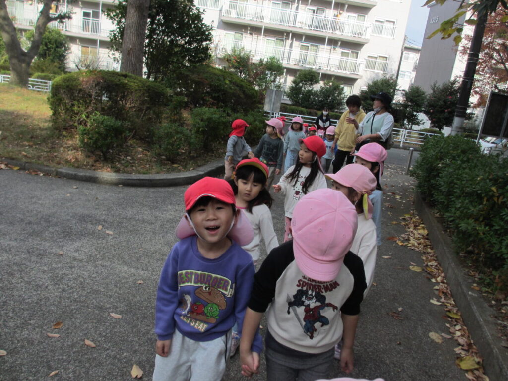 公園では行方不明の危機管理訓練をして、子どもたちにも周りをよく見て行動することや保育者の声を聞いて動くことの大切さを体験を通して学ぶ機会となりました。