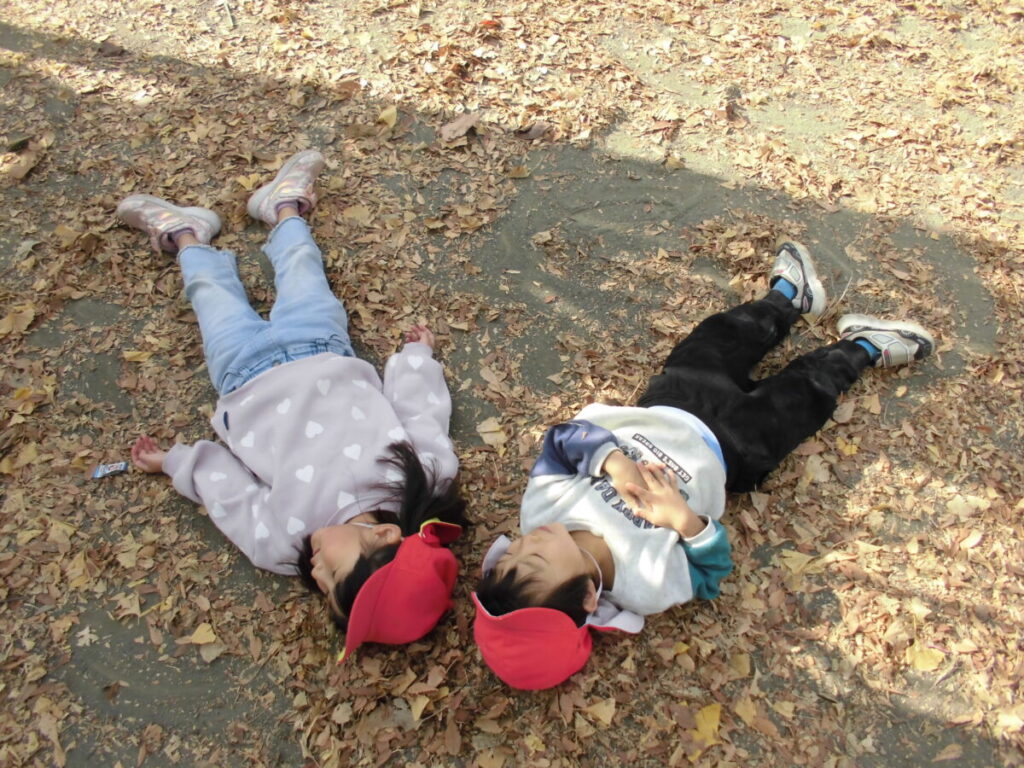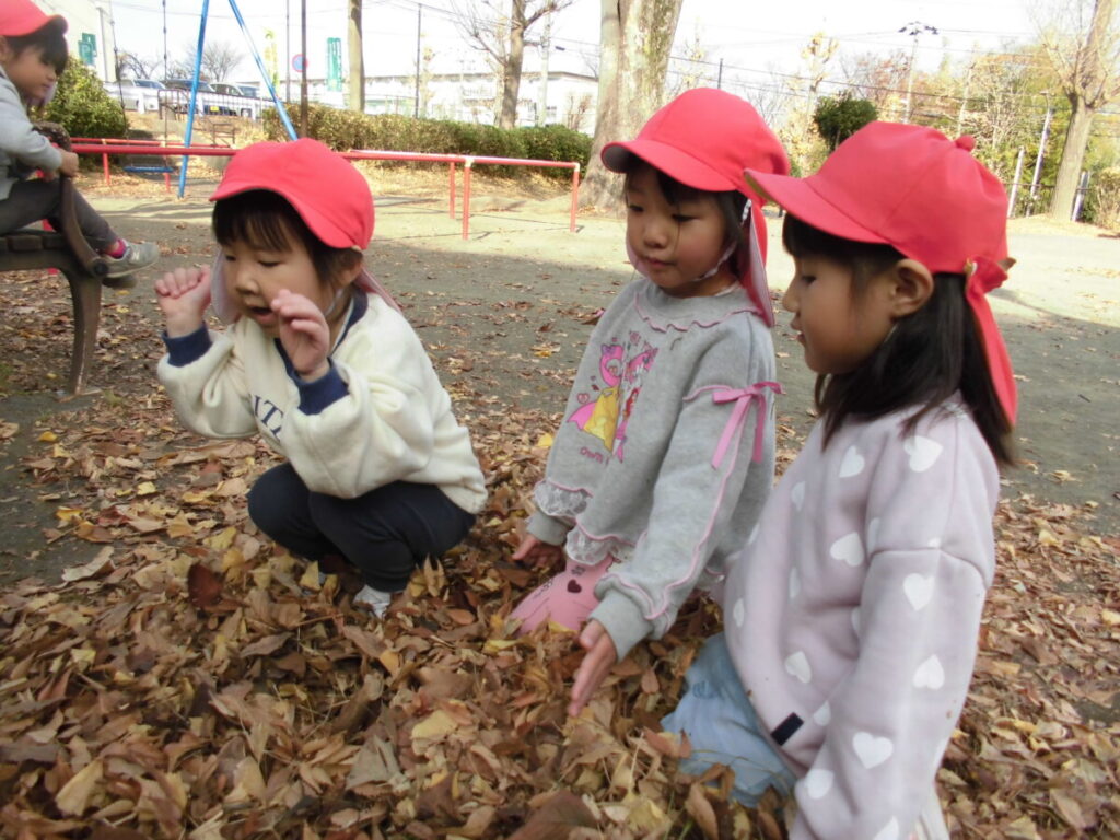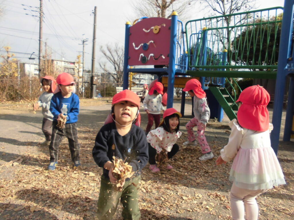 光の遊びは終わり、落ち葉遊びを始めた子ども達…みんなで3,2,1パラパラ~🍂