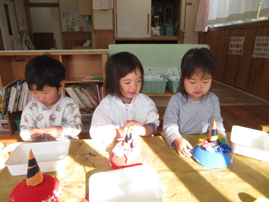 みんな可愛い鬼に変身!帽子を被って鏡を覗き込み、「かわいいねー」「似合ってる!」と子どもたちもご機嫌です!「今日持って帰るの?」と早くお家の人に見せたい様子の子どもたち。もう少し待っていてね。2月3日の節分が楽しみです!