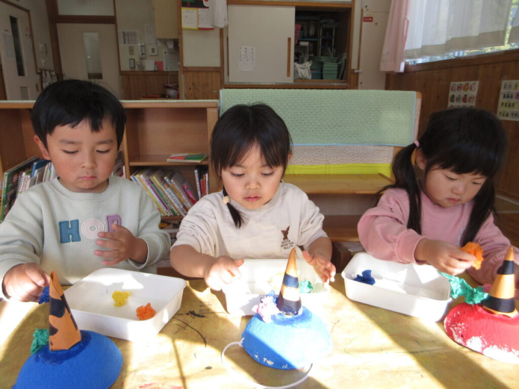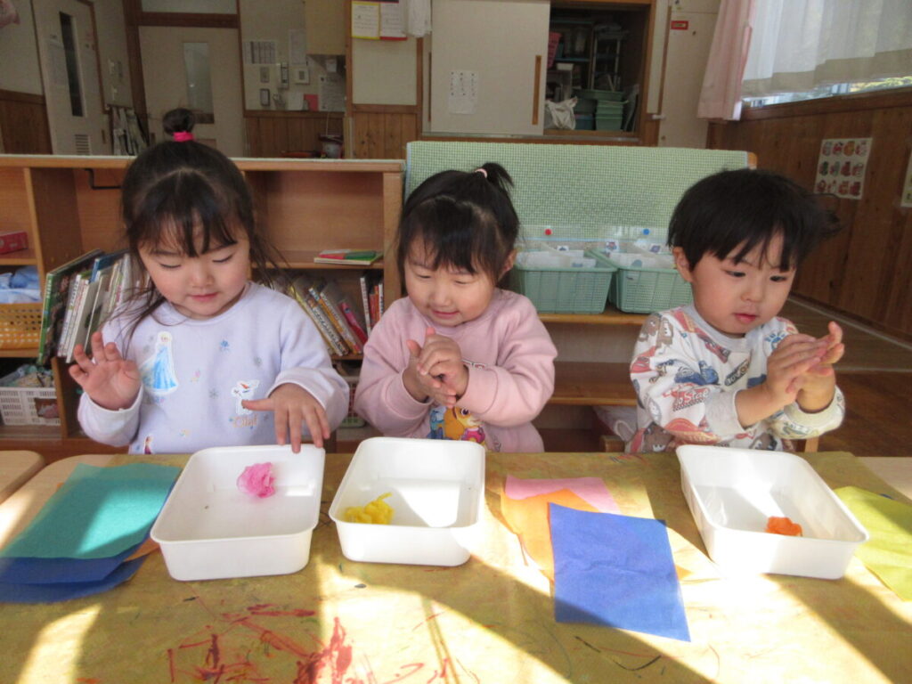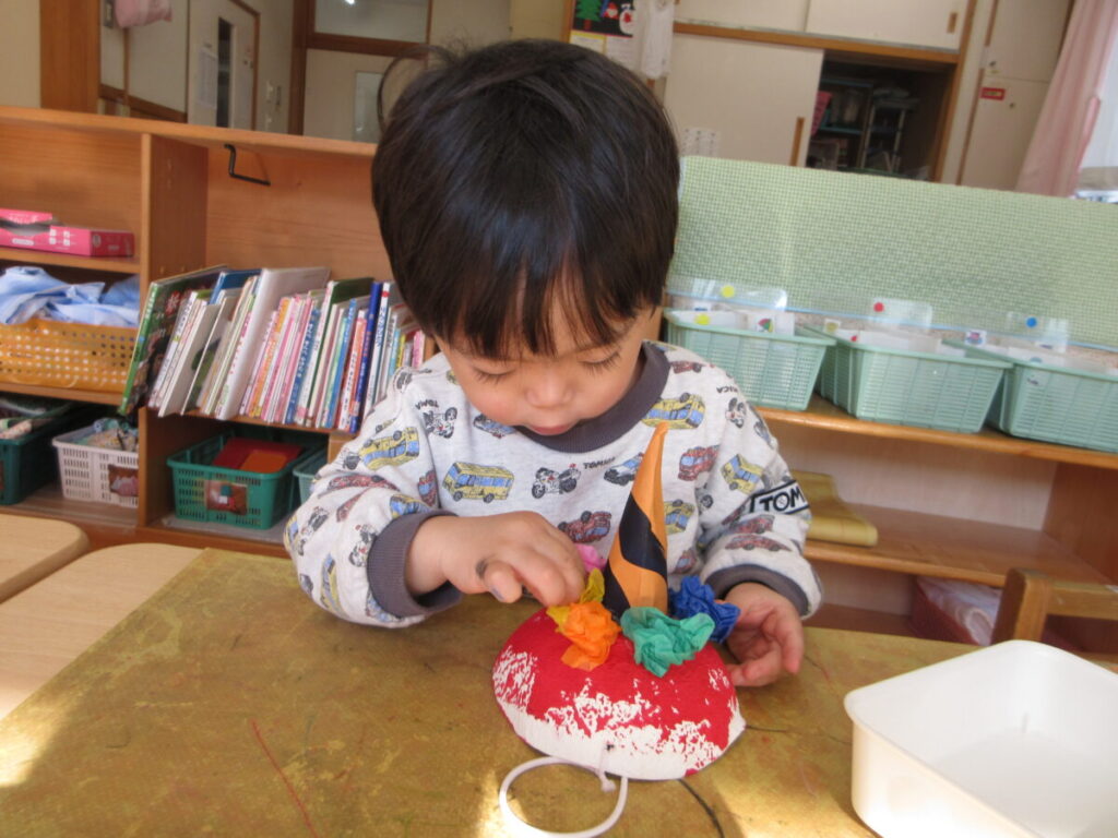 2月3日の節分に向けて鬼のお面(帽子)を作りました。夏に給食室からもらったメロントレイをとっておき、絵の具で色を塗り、一筆書きで角を作り少しずつ制作を進めてきました。今日はお花紙で髪の毛を付け完成となりました。黄色、オレンジ、ピンク、緑、青の五色から好きな色のお花紙を選びます。「何色にする?」と聞くと「ピンク!」「青!」などと、しっかり言葉で伝える事が出来ました。