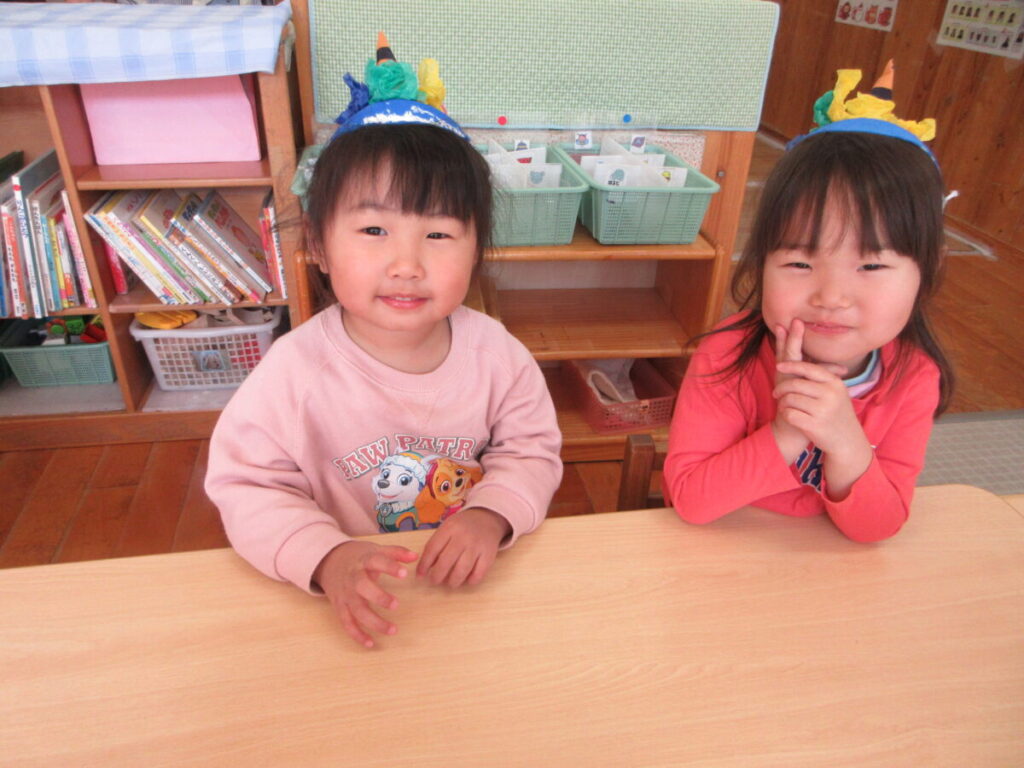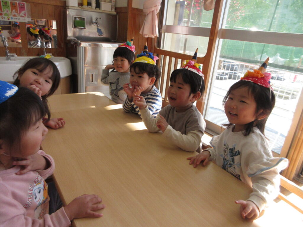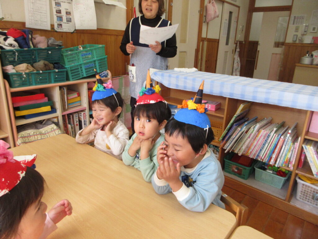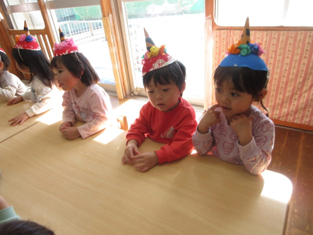 鬼の帽子が完成すると、みんなで被って、節分の日に歌う「オニはうちでひきうけた」の歌をみんなで歌いました。
