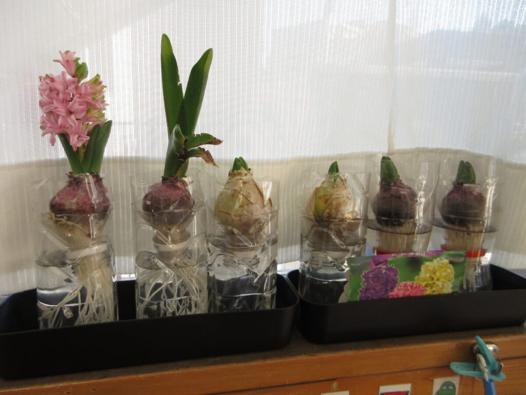 おまけ…11月から始めた水耕栽培のヒヤシンスの花が咲きました。根が出て、芽が出て…生長の様子を日々観察し、「何色の花が咲くのかな」花が咲くのを楽しみにしていました。先日、やっと可愛いピンクの花が咲き始めました。「ピンクだったね」子どもたちもうれしそうです。他の球根は、何色が咲くのかな…たのしみです。