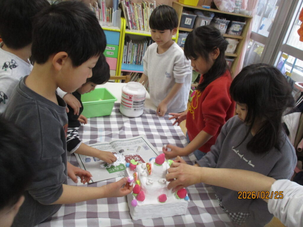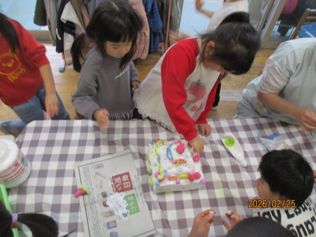 先日、卒園制作として誕生日ケーキの土台を作ったのですが、今日はいよいよ飾り付け・・・
