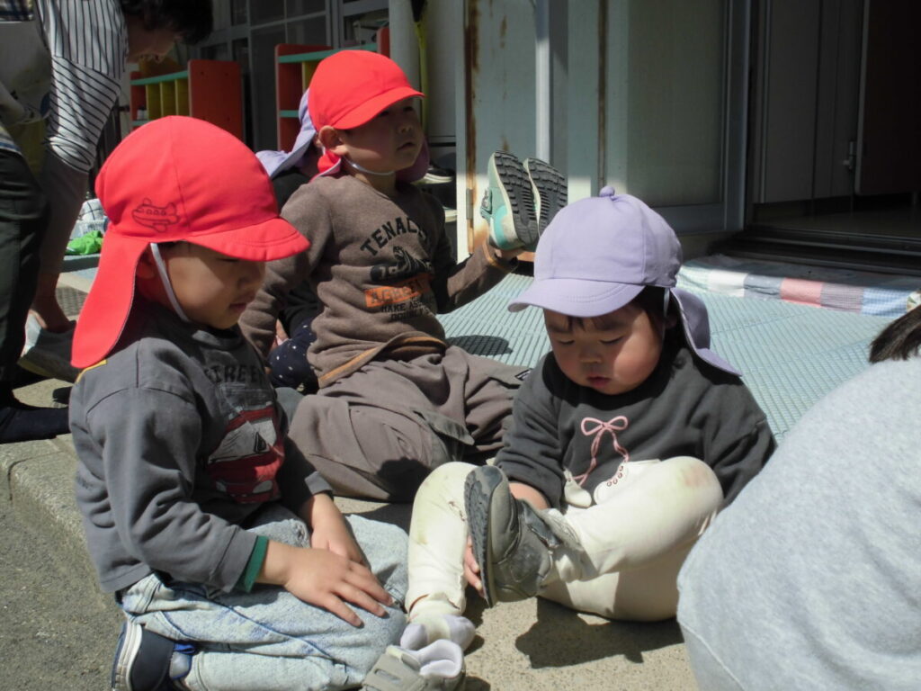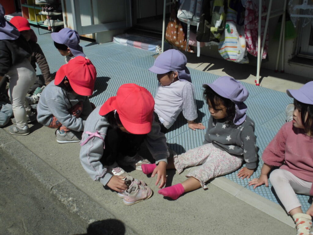 園庭で待ち合わせ…「お待たせ~」にっこにこのりんご組さん、ぺんぎん組さん。