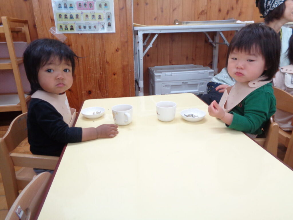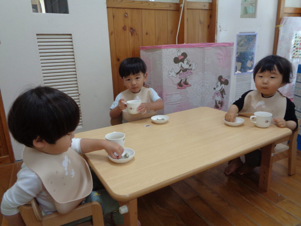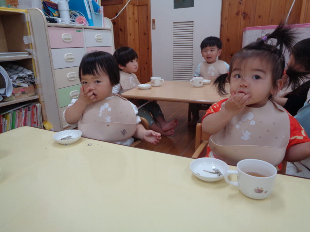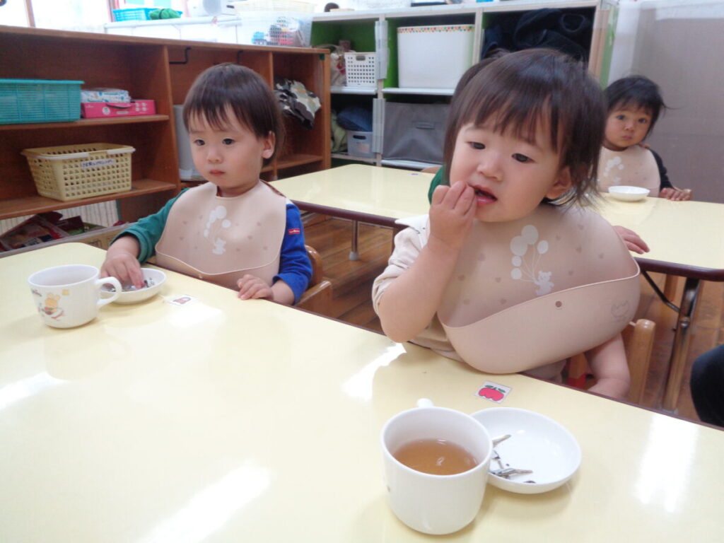 「いただきまーす」とお隣さんのごはんが欲しくなってしまう子、おいしいスープを一気に飲もうとこぼしてしまう子、食べ始めて少し満たされてくると眠くなってしまう子。。。
