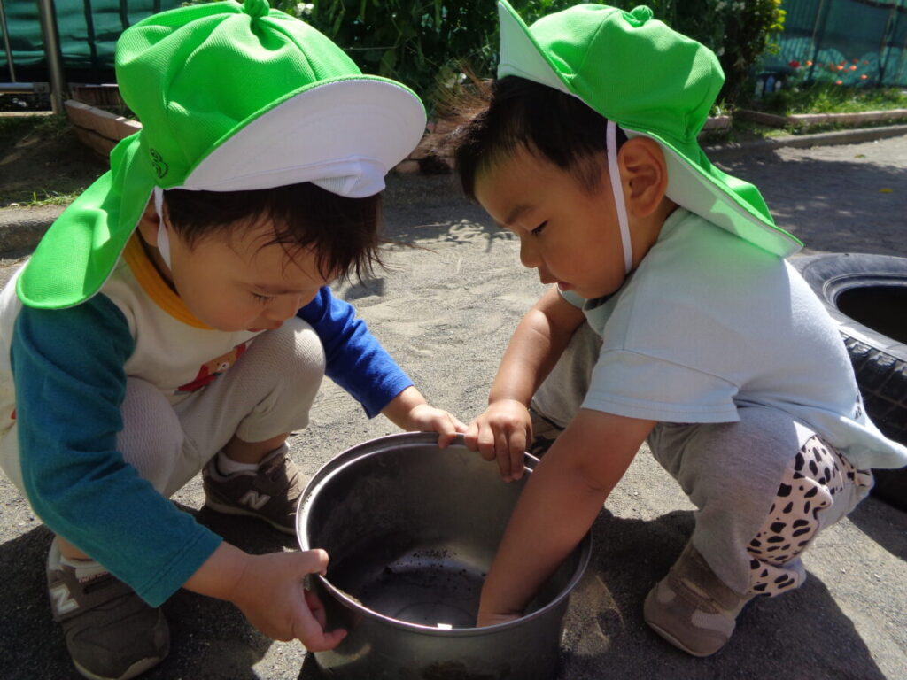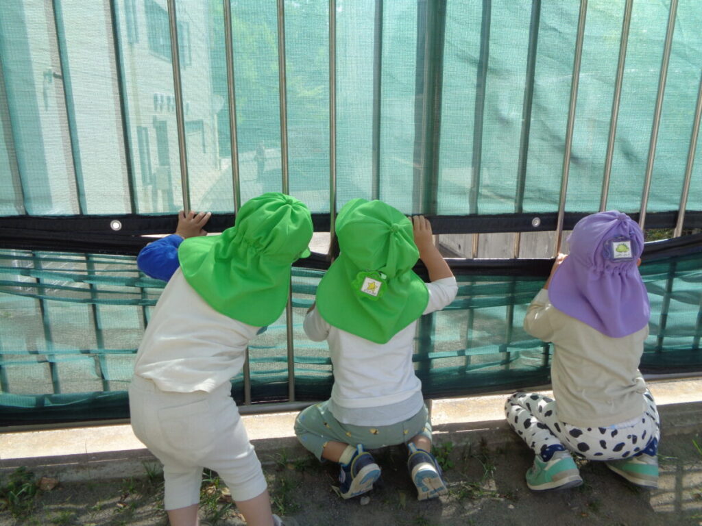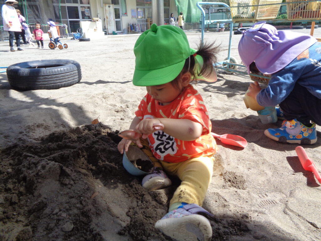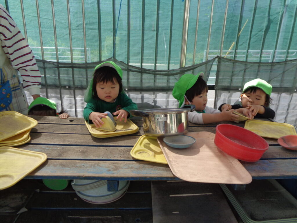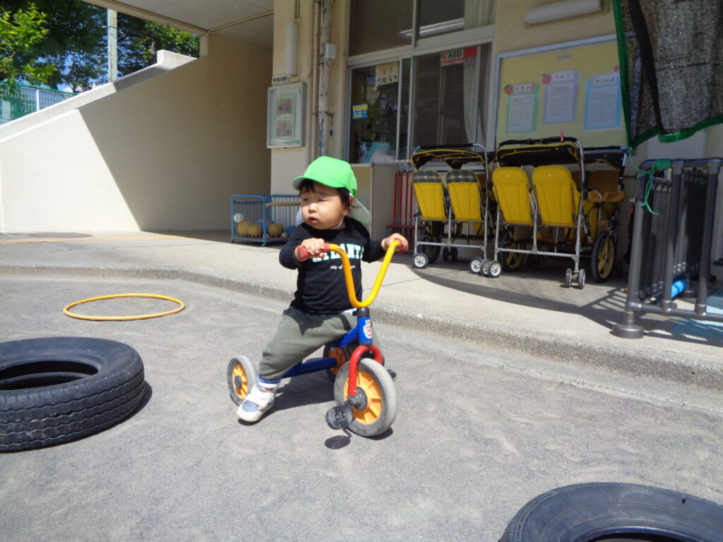 おやつを食べたら、さっそくお外に出て遊びます。